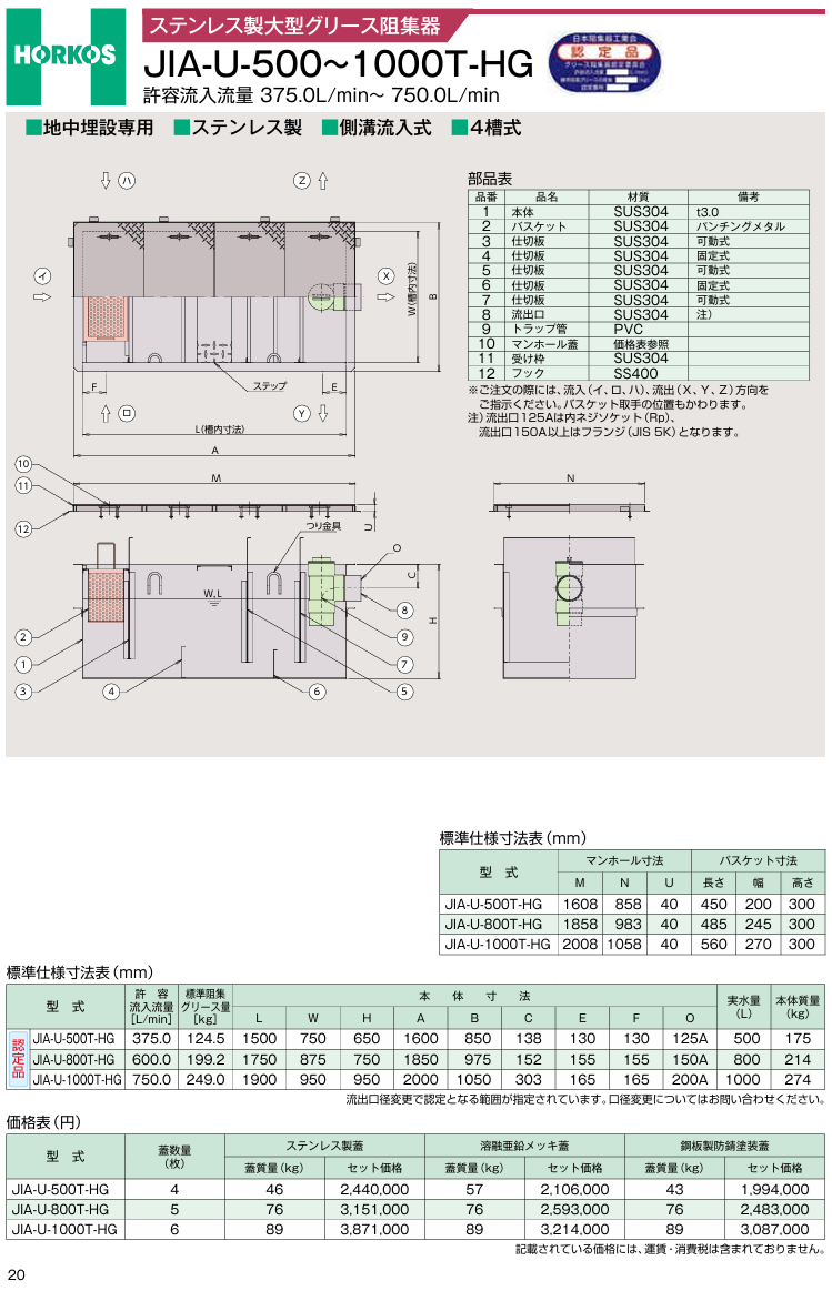 ホーコス グリストラップ JIA−U−500〜1000T−HG