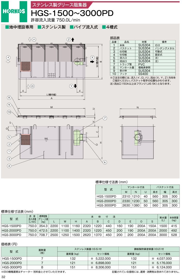 ホーコス グリストラップ HGS−1500PD HGS−2000PD HGS−3000PD 4槽式 パイプ流入式 地中埋設専用