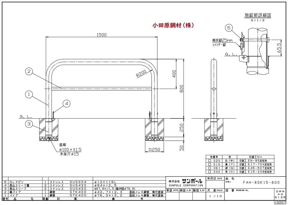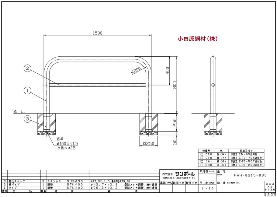 サンポール 車止め スチールゲート バリカーの激安販売! 小田原鋼材(株) FAH−8U15−800