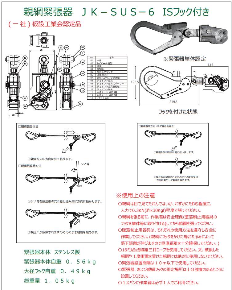 · 緊張器本体 オールステンレス製 緊張器本体自重 0.57kg 大径フック自重 0.41kg